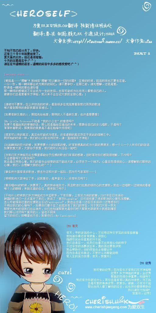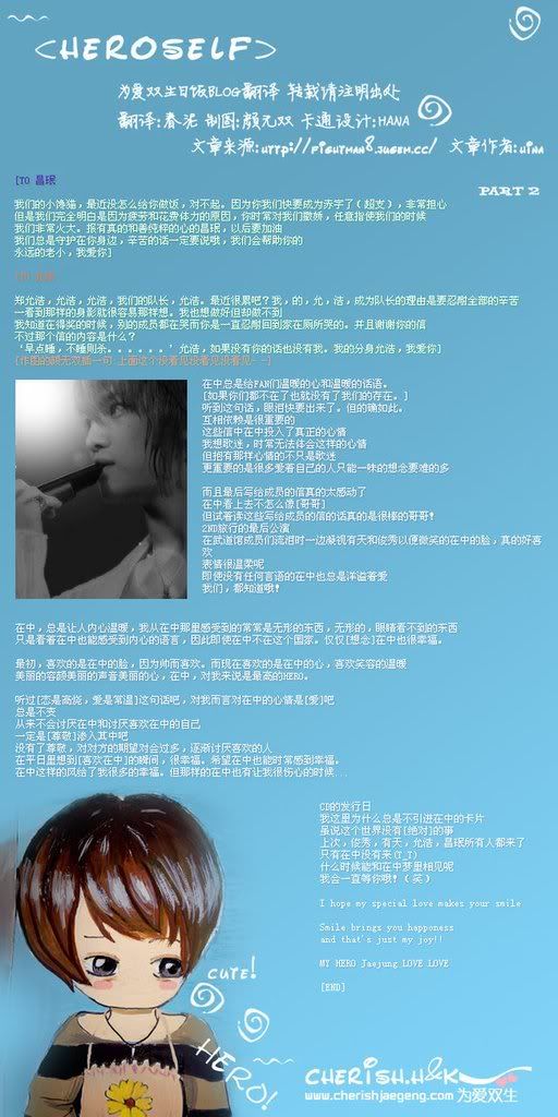 允浩,是我的朋友!我无力的时候。。有我没有的刚强。昨天也。。昨天凌晨也有点依靠允浩,现在东方神起5个人的状况,因为现在的样子非常幸福,却也常想,随着时间的流逝这样的幸福感觉会不会消失?突然会觉得不安,可能是因为秋天的到了。相反的,允浩和我不一样,会往好的方面想。到目前为止一直都这样,以后希望也能这样依靠,真的是最好的队长,谢谢!