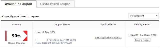 只用一个户口来抢,忘了时间,3.05pm才想到有coupon抢,log in,按一下,竟然有50%。 |