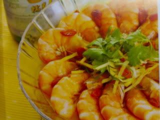 材料:虾600克 ,姜丝20克 ,御膳酒5汤匙 ,枸杞1汤匙