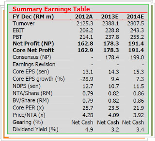 EX-date | 27/05/2013 | Entitlement date | 29/05/2013 | Entitlement time | 05:00:00 PM | Entitlement subject | Final Dividend | Entitlement description | Final Single-Tier Dividend of 7.69 sen per ordinary share of RM0.50 each in respect of financial year ended 31 December 2012 | Period of interest payment | to | Financial Year End | 31/12/2012 | Share transfer book & register of members will be | to closed from (both dates inclusive) for the purpose of determining the entitlements | Registrar's name ,address, telephone no | Symphony Share Registrars Sdn Bhd