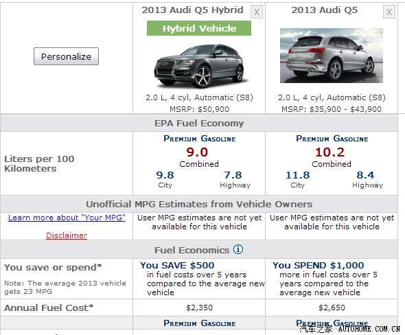 美国现在还没有A6混动,不过已经有Q5混动,EPA油耗测试显示很坑爹。