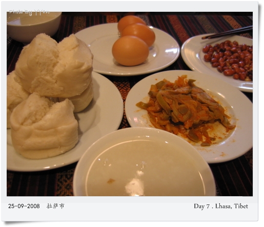出来。已经是中午一点。走到最靠近的餐厅慰劳五赃庙。雪域餐馆是拉萨频有名的餐厅。就在大昭寺出来广场的右转角处。这里的价钱,对背包族来说,价格比较昂贵。毕竟吃在名气大的地方,价钱也需要有“名气”的。这几天我们省下来的钱,可以好好的享受一番。点了牦牛牛扒和煎饺子。味道只属于中上。牦牛牛扒吃得还真累。那个叫做自作贱,已经知道它是很韧,需要嘴嚼很久方能下肚的,就只因为为了试而试的心态,我们的嘴,后来运动过度。