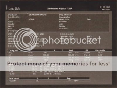 这次因为小贝比入盘了而照不到脸,所以Dr Ng也没开4D给我们看。当他问我们是否有看到小贝比的头发时,看着黑白画面的我们是看得一头雾水啦,于是老公问回他在那里。他就指着有很多条白色的线说这些都是头发,你看,很长呢。哦,原来那些线是头发,它们看起来真的蛮长的,大概有3-4cm吧。