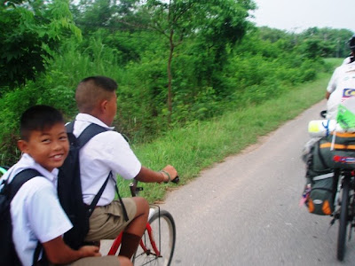 骑着骑着,不久天开始亮,学童也三三两两地结伴上学去…… |