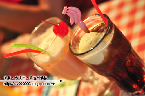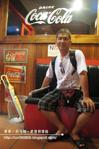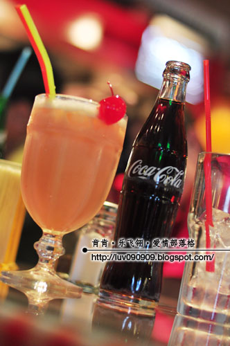 这里有很多东西看,很多东西买,也有很多东西吃。那我们到底要吃什么呢?之前说要去便便餐厅吃便便餐,结果因为下雨而且找不到而放弃,随便闯进了一家叫做“可乐森林”的美式餐厅。位于二楼的可乐森林,入门处都是以可乐为主的装饰品,正中了老公的下怀咯~