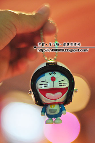 中途老公突然离座,以为他去外头抽烟所以也不以为意。谁知道他回来的时候突然把一个东西递了给我。。。是小叮当!还是带着铁帽的咧,好有台湾的味道哦!呵呵~~ 原来老公在抽烟的时候看到有人在隔壁店的夹娃娃机前屡试屡败,于是在对方离开后就放NTD 10试试看,结果竟然一次就夹到了!反正主餐还没到,就先替老公给的惊喜拍写真好了,好可爱哦~^^