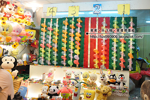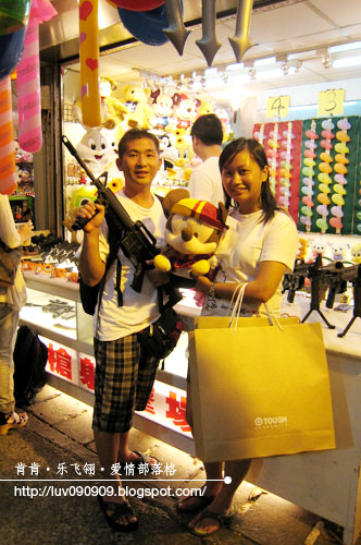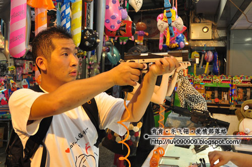 淡水也是一个很热闹的夜市,所以也少不了游戏,是老公最喜欢的了。趁我不注意的时候,老公又跑去玩射击了!这一次花了NTD 400才赢回一只米奇娃娃,好贵哦~ 但是那老板一听到我们说要拍照,就马上递了一把大枪给老公作道具,威风吧~^^