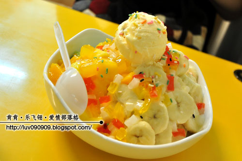 我们来到了一家吃冰的店,店很小但总算还有一点空间可以摆放这只猴子。我和Blaze分别点了两份冰品(NTD 90x2)芒果冰和杂果冰,没想到却那么大份,我和老公合吃一盘也觉得很饱,可是Blaze却可以一个人吃完,好厉害!
