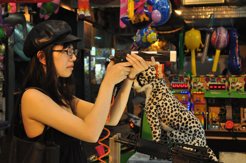 在夜市里走走也觉得有点无聊,因为台湾的夜市都长得差不多,所以我们都开始麻木了,宁愿去玩游戏还比较实际。兜兜转转,我们又回到了之前玩射击的摊子,这一次Blaze也有了玩兴,看他们拿枪的样子,酷吗?