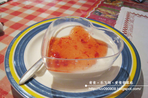 最后就是我们的甜点,是草莓牛奶布丁,口感类似我们在五角船板吃的牛奶麻薯,不错~
