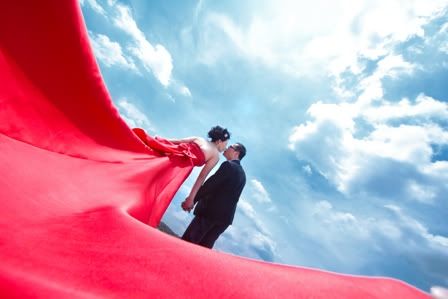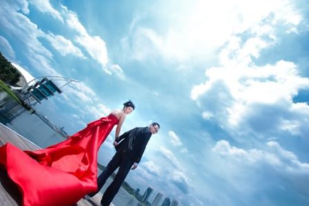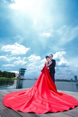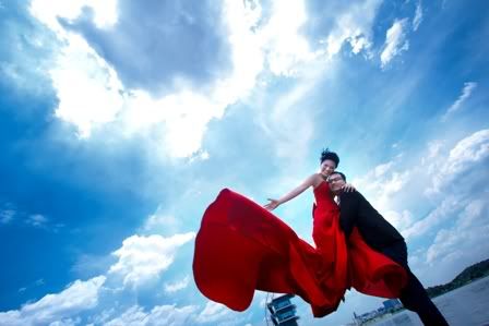 蓝天、白云,加上你那耀眼的红色拖尾晚装,