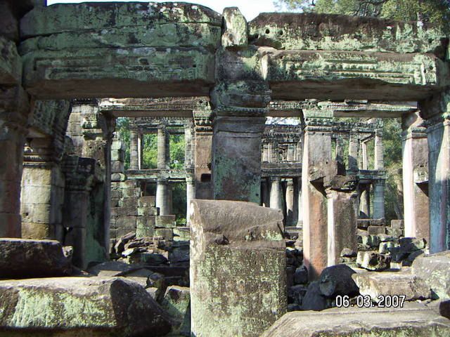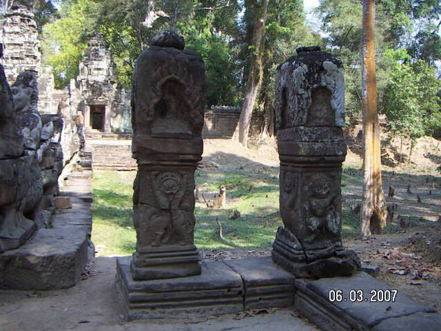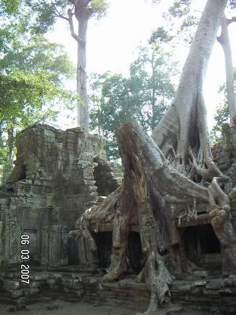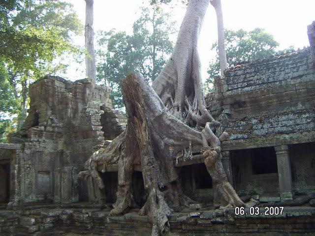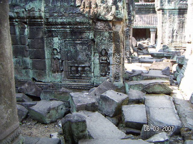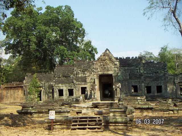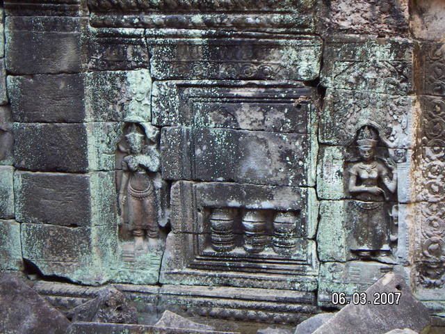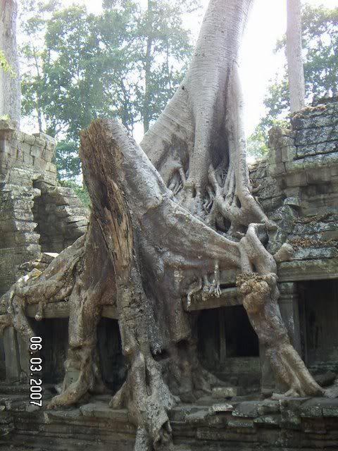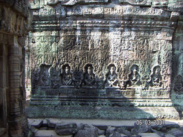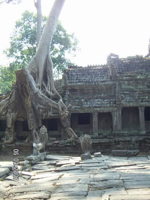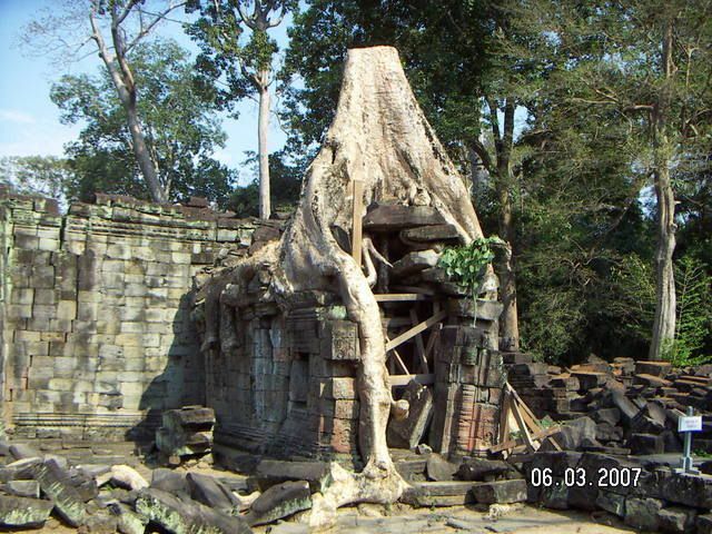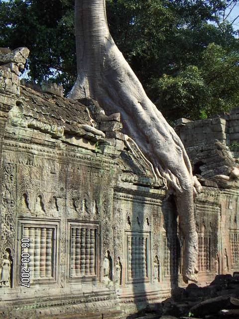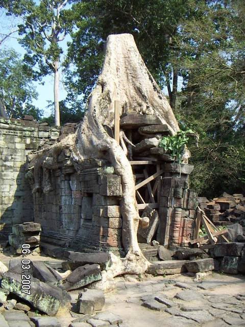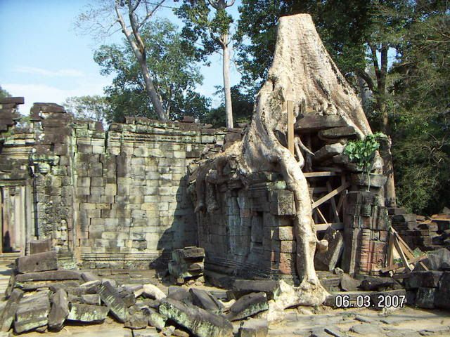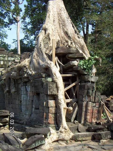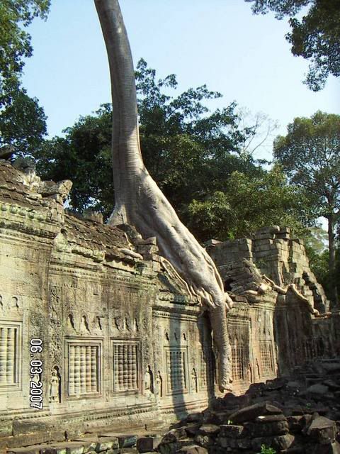 小圣诞,你都拍到东城门墙与树的纠缠。 还有,在Jayavarman VIII 时代因信仰倾向印度教而把庭院里墙上的佛像强行毁坏的痕迹,难得哦! |