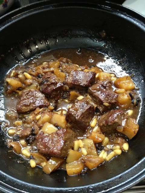 刚刚用塔吉锅做了这个充满摩洛哥风味的闷牛肉,加了肉桂粉,萍果粒,葡萄干(原食谱是prune,我没有就用葡萄干代替),松子和蜜糖。真的好有异国风味但是味道又融合的很好。