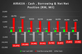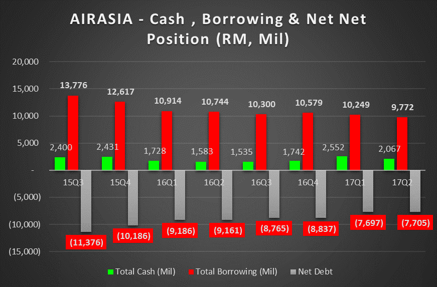 AIRASIA的债务持续在减少,不过Q2派发了12分的股息,因此现金减少RM401 mil,Net Gearing 现在是1.35。而且公司刚刚公布派发12分的股息,Q4的现金会再度减少RM401 mil左右。