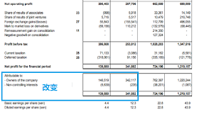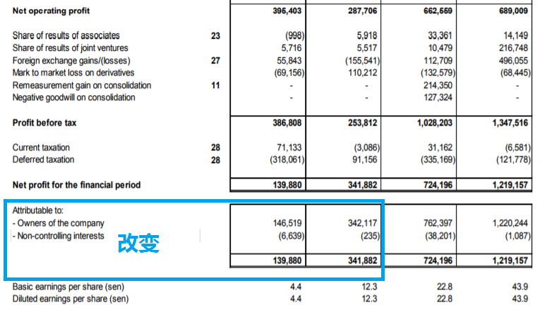 晚上7点钟的时候,出现amendment,笔者就觉得奇怪,做么Non control interest分到那么多,最新的Net Profit变成了RM139.88 mil。因此盈利从2.8分增长到4.4分,而盈利从按年下滑73%变成下滑59%。这今天也发生在TONGHER的身上,盈利从YOY下滑变成YOY上涨!