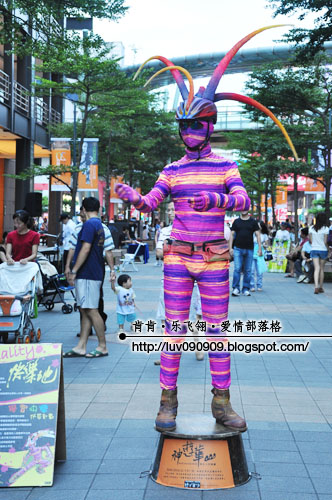 看看时间,我们可不能停留太久,可是往往总有事物将我们吸引住,看看这个穿着整套自行车装的人在干嘛?一直在那边转换着不同的姿势,有点像机器人。可是我来不及去看他面前的牌子,所以拍了就走~