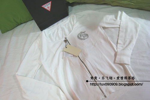老公对名牌稍有认识,所以寻宝这样的任务就交给他咯,何况衣服穿在身上,也是给他看多啦~XD 他翻翻找找了一番,就拿了一件长袖衣(原价NTD 4880)给我,很美哦~ 这其实是一件风衣,但是因为后面有一个大大的GUESS标志,所以设计师也巧妙地将风帽隐藏了起来,所以这件衣服其实是多变的哦~