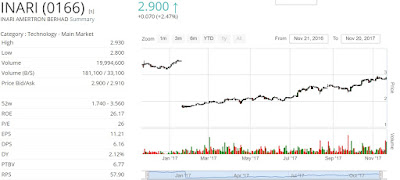 看回Inari的股票,在2013年时,它的股价才0.2 cent这边吧。那是因为Inari在去年和今年,总共进行了两次的Bonus Issue。现在回首查看Inari以前的股价趋势,不禁觉得,凭什么Inari的股价可以从0.2一路向北的达到今日的2.82。Inari这个企业有什么本事,可以赤手空拳一路拼到今日马股semiconductor领域Market Cap最大的公司,就以今日24/10/2017的股价,Inari的Market Cap高达了5.7 billion。