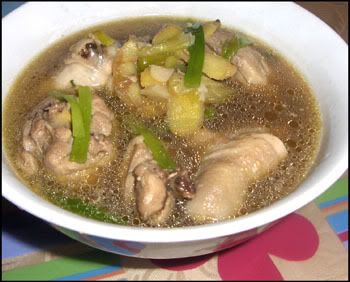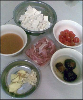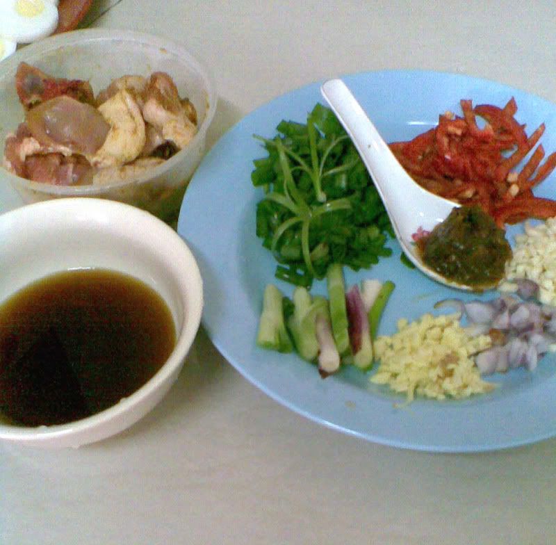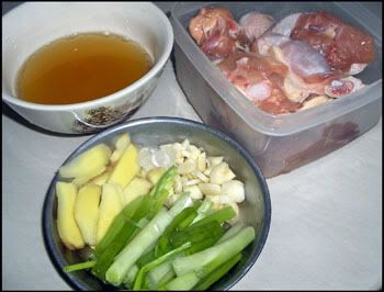 材料如图,鸡肉要用麻油姜丝生抽腌过.