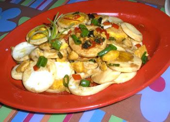 2)爆香红辣椒丁,加入调味料慢慢拌炒蛋片,最后加如葱粒就好了.
