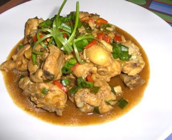 少许油炒香蒜米与姜片,下鸡肉炒一会