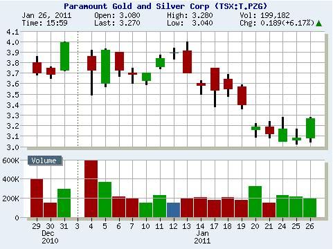 Paramount Gold and Silver Corp. (PZG) - Paramount Gold and Silver Corp. (PZG) is my Top Gold Stock for 2011. PZG held $3.00 over the past two days which is very bullish. I bought PZG today between $3.06-$3.09 and again on the break above $3.17. I plan to buy more if PZG can break up above $3.30.
