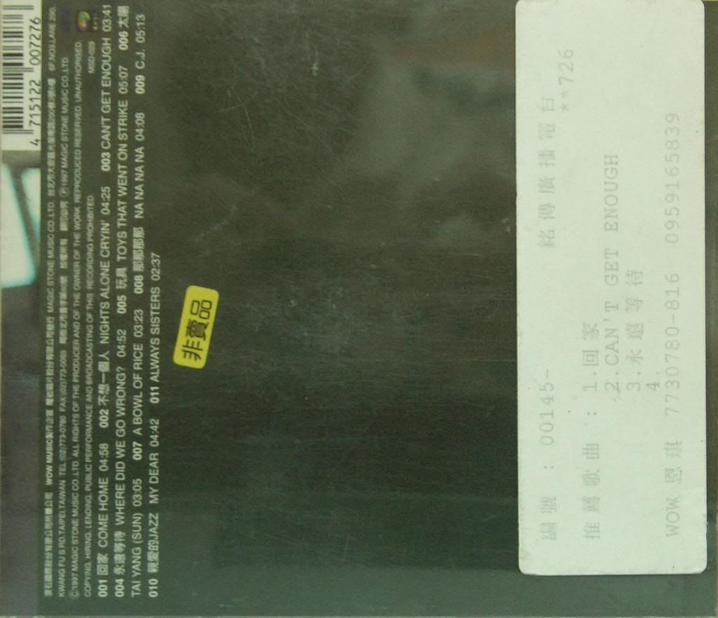 想问一问各位收藏家,顺子-《I Am Not A Star》,台湾首版的内圈是否有中文字《魔岩唱片股份有限公司》。我收到的版本只有MSD041(m8785) IFPI L826, 音质有些硬,不懂是哪里的进口版?? 还有杨乃文的<one >,我也看过有中文字《魔岩唱片股份有限公司》,但我收的版本只有MSD -025 RPT 33 IFPI LE18, 不懂那一是台湾首版??? |