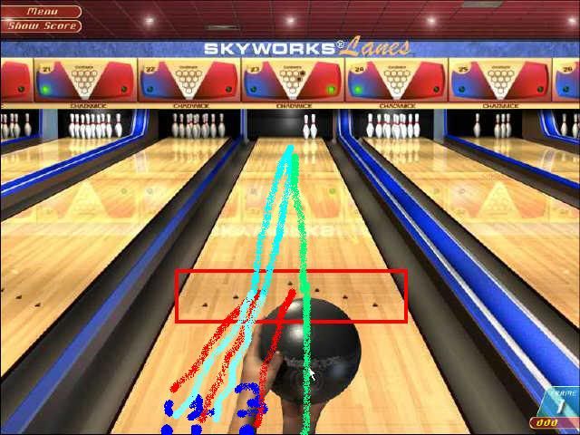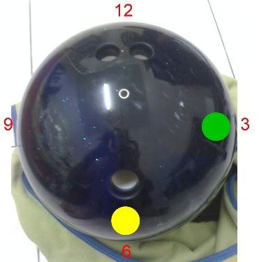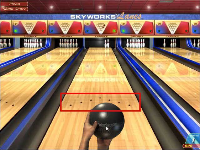 2)然後你的球只可以落在球道上左邊的第三個點上,既第25片板上,看看球會跑到哪裡去。。記住右手一點要往上拉,不可再掃去左肩膀那裡。