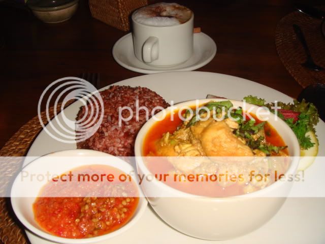 然后是招待员介绍的Wayan's Chicken Curry, 还有外子喝的cappucino.Wayan's Chicken Curry不是想象中好吃,curry一点都不辣,只有厚厚的椰浆味.看上去像炒饭的饭没味道的,原来是用红米的,很有营养哦 其他配料ok.整体来说不错,可能不适合我们马来西亚人的胃口。。哈哈。。这蝶curry chicken要rp 47,500哦。。指数:7