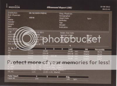 照超声波时,Dr Ng量了小贝比的头部、腹部和长度后,竟然忘记检查心跳。当时我顾着看小贝比的重量也没想到,所幸最后他想起,就开给我们听,这次平均有144bpm。测量结果显示小贝比的重量是3135g,两个星期内增加了358g。根据我的体型,Dr Ng说可以自然产的条件我都符合了,所以80%能自然产。至于那20%是要到真正分娩时才知道,因为会有很多因素影响,如宝宝在里面便便了、宝宝的心跳变弱或子宫颈开太慢等等。