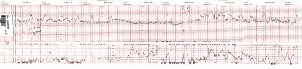 抵达医院后,我们就直接到急诊室去报到。我告诉那里的护士说我有阵痛,可是没来红或破水。她吩咐我坐在一张轮椅后,就由一个男护士推我上一楼的产房去。到了那里,值班的护士就叫我躺在床上,然后她拿了一个探测器开始找宫缩的地方。找到后,她就把它绑在我的肚子上。接着她拿了另一个探测器找小贝比的心跳,同样的,找到后,她又把它绑在我的肚子上。下面的图表就是由那两个探测器测量出来的,上面那一部分显示小贝比的心跳,中间有断断续续的横线是小贝比的胎动,而下面那一部分显示我的宫缩程度。就在我们赞叹着这仪器很先进时,那护士告诉我们说外面已经有更先进的,还有荧幕显示呢。现在这个也不便宜,一台要价十千,所以院方没打算换。