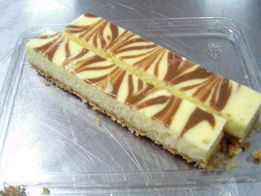 *巧克力大理石乳酪條派,乃預留少許乳酪糊,加入少許巧克力醬拌勻,倒入擠花袋中,擠在乳酪派上入烤箱烘烤即成. |