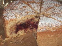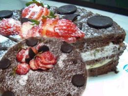 6.取一片蛋糕抹上藍苺醬,蓋上另一片蛋糕,於其上用湯匙挖布丁平鋪在蛋糕上,再將第三片蛋糕覆蓋,用抹刀均勻抹上巧克力醬,再把草莓,鈕扣巧克力放置蛋糕上裝飾,果膠稍加熱後刷在草莓上,最後撒上防潮糖粉即完成. |
