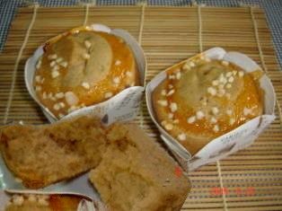 4.麵糊裝入擠花袋,擠入模型杯約八分滿,把(d)擠一圈在蛋糕糊上,撒些杏仁角裝飾.