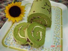 5.拌好的麵糊倒入烤盤內表面用刮板抹平,輕敲烤盤一下即送進烤箱以180℃/160℃烤約15-20分鐘,蛋糕烤好出爐後再輕敲一下,待稍涼,抹上發泡奶油捲成圓筒狀,入冰箱冷藏20分鐘定型,即可切片食用。