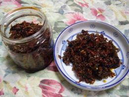 吻仔魚120g(可多些) 朝天椒(怕太辣少放再配些普通紅辣椒)適量 濕豆鼓2湯匙 蒜頭5~6顆(喜吃蒜者可增加) 蠔油1大匙 糖1大匙 米酒少許 芝麻香油適量