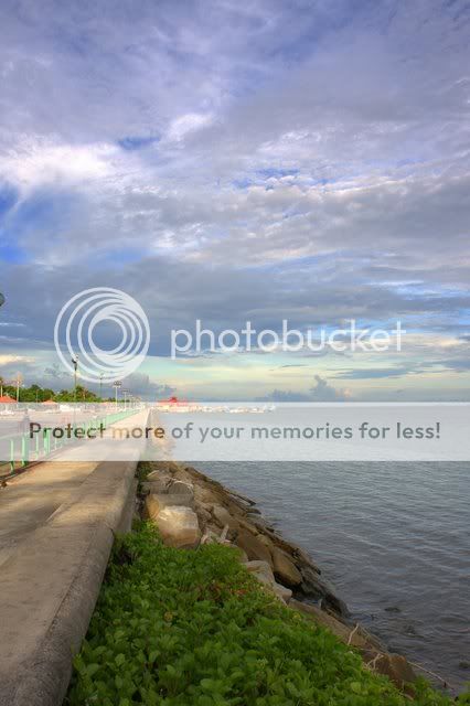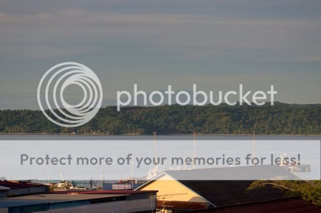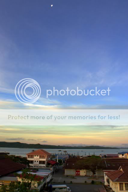 很累所以睡迟了没有去天涯海角看日出,Kudat 市区 Ria Hotel 我们的 Deluxe Room 阳台外的早晨。月亮还清晰可见,还有远处的神山。