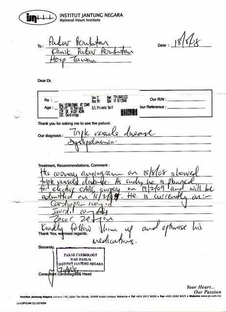 我来马后炮一下: 如果当时他有在斗湖医院(第二次)复诊的话,然后他们又给他做 exercise stress test的话,以你老窦这样严重的3 vessels disease (三条冠状动脉阻塞)看来,EST 得到阳性的机会很大,应该是跑不了几分钟,就有心电图上的变化。而如果是阳性,加上你们要求,得到有官印的转诊信的机会几乎100%,这样一来,也省却了一番功夫。现在回想起来,你老窦初临吉隆坡然后还跑这里闯哪里的,以这样严重的三条冠状动脉阻塞来说,事后想起来,我还真的替他捏了一把冷汗。