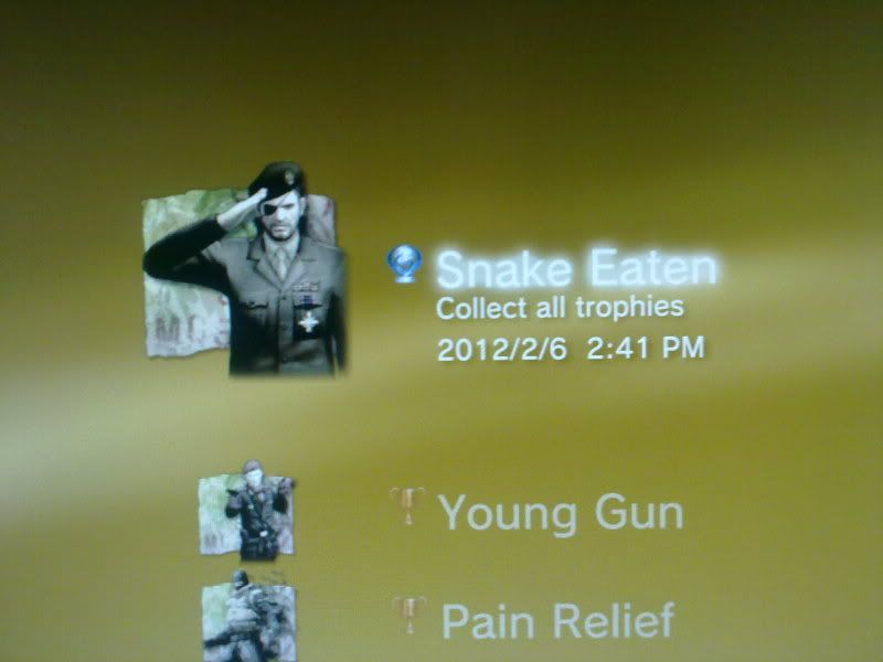 如果MGS2白金难度是11/10 (超难!)的话,MGS3白金是超容易的3/10,只要一周目就能白了!唯一困难应该是摩多车追逐战要射中青蛙公仔。还有就是不杀人爆机的奖杯,因为在摩多追逐战我以为如果我射迷昏弹而导致敌人撞车也会算Kill,结果任他们射我 , 后来我试多次发现其实是不算杀人的... 我整个游戏在Normal进行,如要追奖杯可以只玩Very Easy,应该是最好玩又最易拿白金的游戏!赞!! |