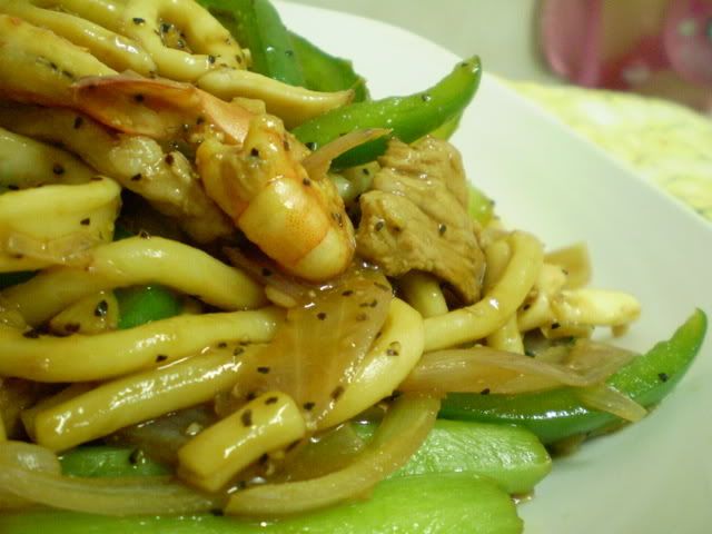 3。加入乌东面,黑胡椒末和调味料炒匀,然后倒入上汤煮沸,最后加入青椒丝炒匀便可。