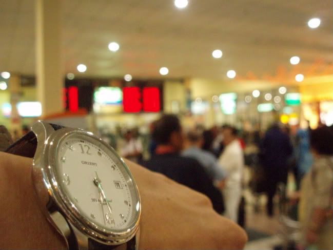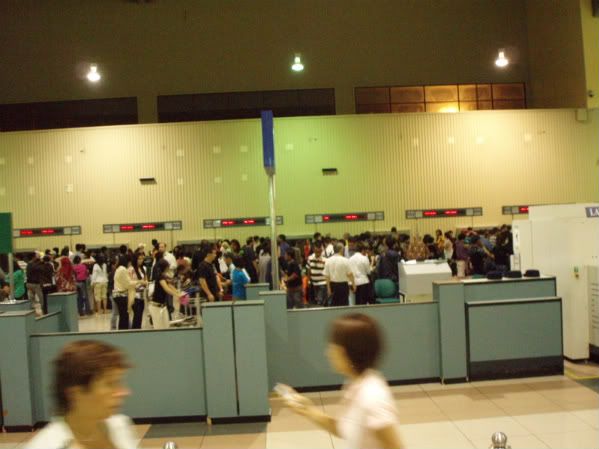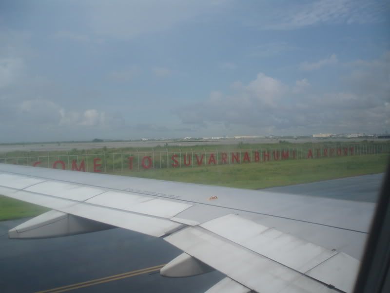 看了看窗外,已经看到陆地了。。。 那时好高兴,好高兴,一直跟豪讲我们到泰国了,忠于到泰国了。。 哈哈哈!这时的曼谷下着小雨。从远远看来,机场终站好大哦。。。是一个大 U 型的机场,被铁壳包围着。就这样, 我们在细雨中安全到达曼谷!