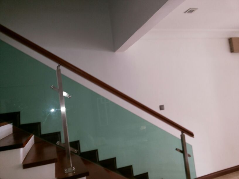 Tempered glass railing with stainless steel RM250 per foot run (大概的价格), handle wood RM50/ foot run