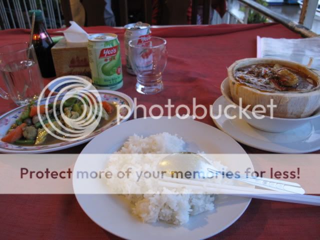 Aamok chicken in coconut cell + Fried mixed vegetable with oil, oyster sauce + Winter Melon Tea + 荔枝水 午餐和晚餐一起来