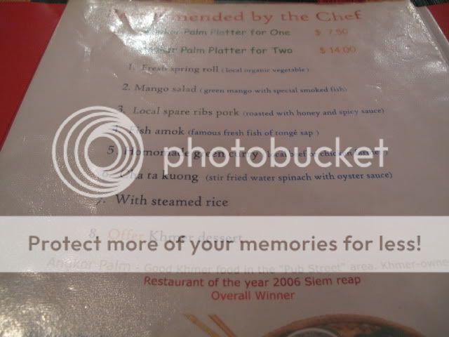 过后Pete就我drop在Pubstreet, 我就来原来就计划好的Angkor Palm吃晚餐, 老板得过2006年Siem Reap什么美食比赛的奖, 所以喜欢美食的我是一定要吃吃看的.....