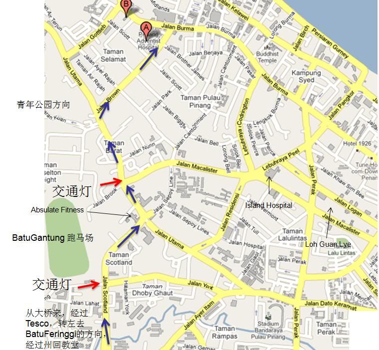 楼主,我补充一下19楼网友的资料。 你是从大桥那边来,看到tesco,就靠左边行车,向batu feringgi的方向。经过州回教堂,上天桥,不久有个交通灯。Batu Gantung的跑马场是在左边,你再向前走。不久absolute fitness在左手边,转左。 来到那个交通灯,根据19楼的资料是转右边。不过你可以选择直走,因为不用进到Pulau Tikus繁忙的地区。直走不久(大约六七百公尺),你要靠右边驾驶,来到一个路口,左边是转去青年公园(Youth Park),你必须转右边,直走就可以了,就来到Jalan Burma,前面就是Midland One Stop 不过在你还没到那个路口前,你可以看到一个网球场,你也可以转进去那个路口。因为槟安医院另外一个进口在这里。