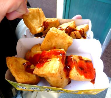 我在南京夫子庙夜市也是有买臭豆腐,不过还是焦赖的味道比较臭!哈!