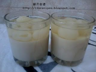 待豆奶有80%凝固的时候,将龙眼铺在豆奶上,加点龙眼糖水