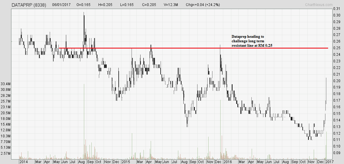 As you can see in this chart, Dataprep had risen sharply in the past 2 days, however, if you would ask me, I would say Dataprep could be ready to breach above RM 0.25 in the coming days. Why now? Why not earlier why I had mentioned before in 2015 ?