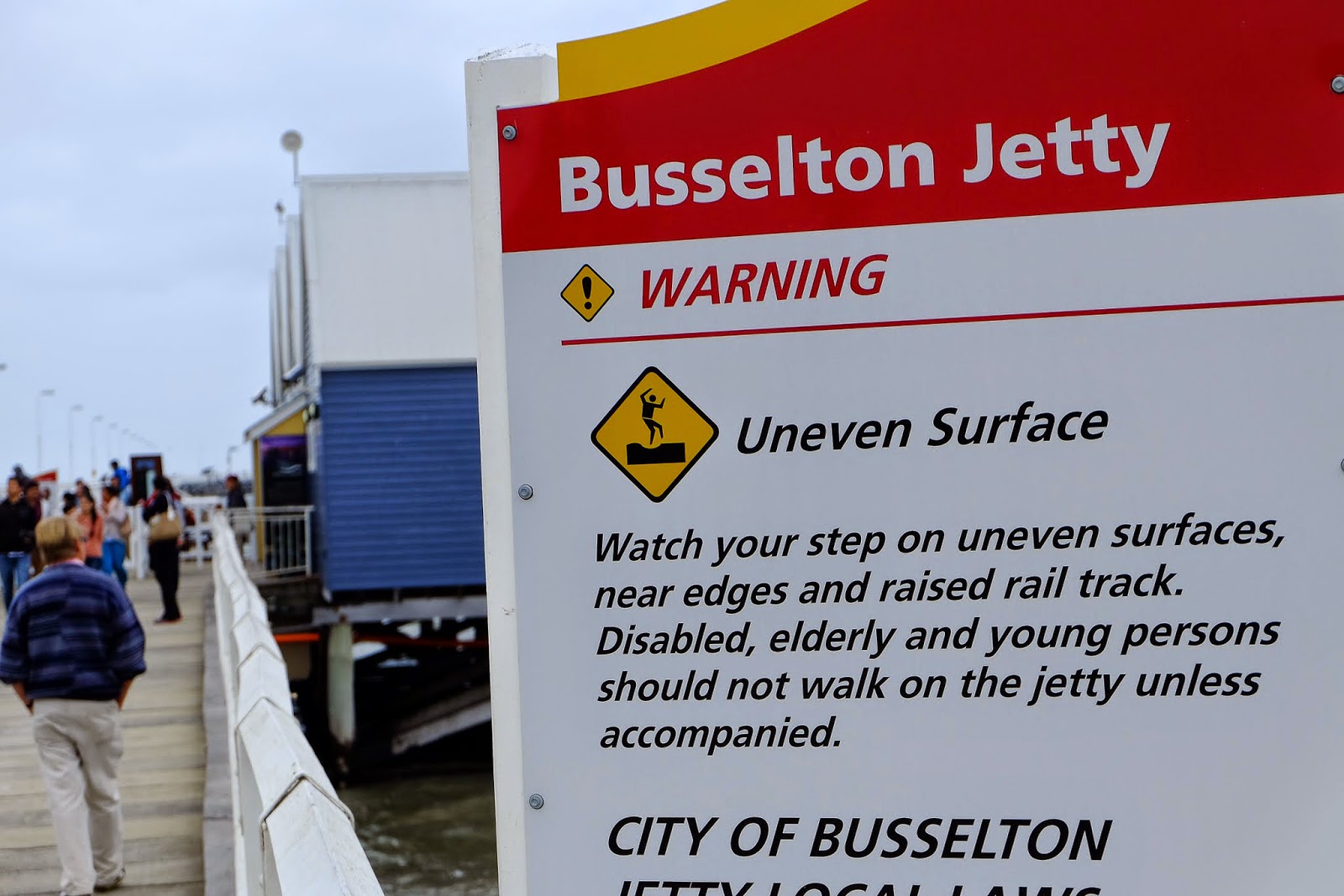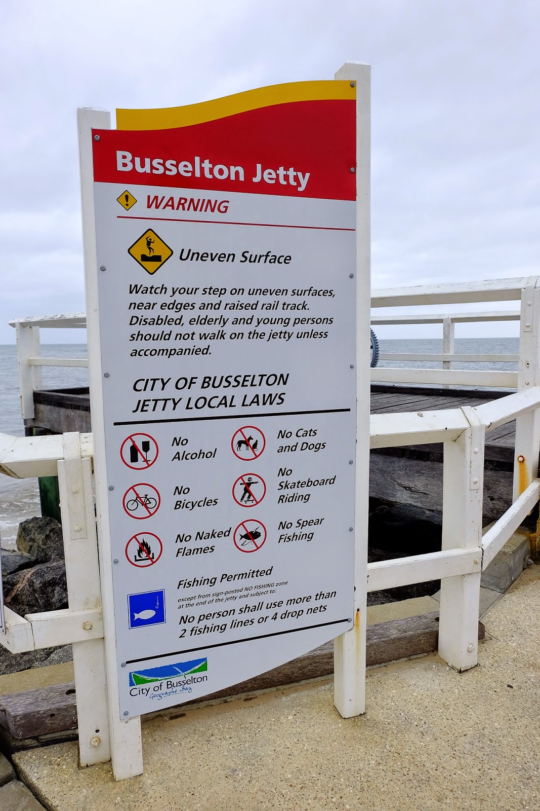 Buselton Jetty,之前没有时间去所以会Perth city 时才去参观。 Buselton Jetty是我指定必去的景点之一。很特别吗?也没有,但我看了一下很美的Buselton Jetty照片,所以很想去看看。 这里有1.8公里长的走道,你可以买入门票而已,也可以买电动火车的票。 我们决定走路,省钱又可以欣赏风景。今天这里虽然没有蓝天白云,但还很凉爽。 听隔壁单位的邻居说, Buselton码头昨天关闭,因为大风大雨。