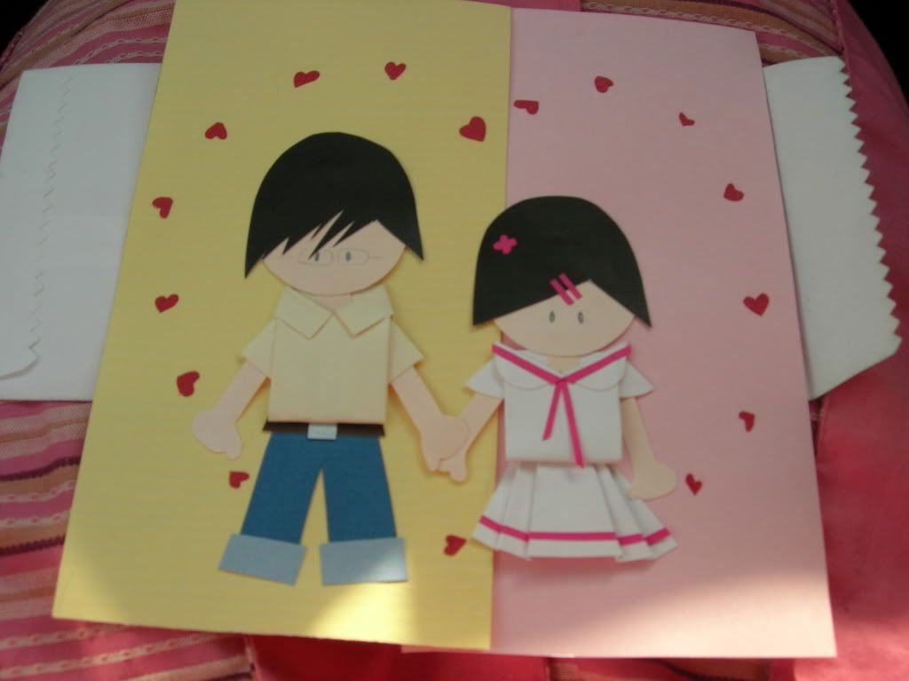 这是和男朋友庆祝一个月周年,做给他的礼物。是两张书签卡来的,合起来就变成牵手和给一个心围起来。。